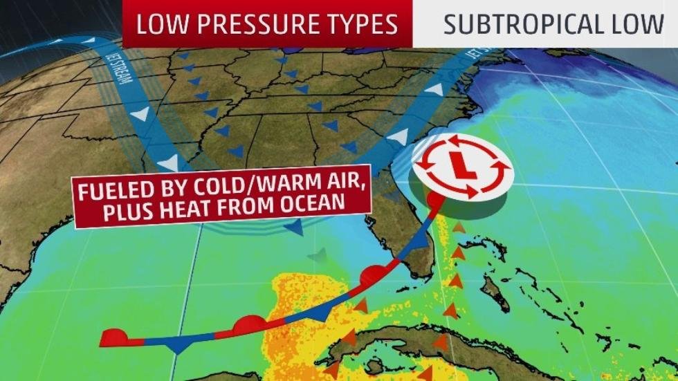 If the ocean water is just warm enough, and winds at jet-stream level aren’t too strong, thundershowers can build and persist around the center of this stalled low, slowly warming the column of air near it enough to form a subtropical storm, a mix of a tropical storm and one you’d typically see over land areas with warm and cold fronts.